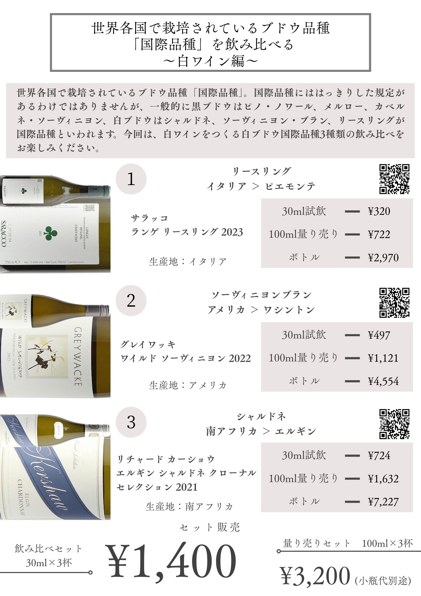 試飲販売ワインはすべて100mlボトルでの量り売りが可能です。