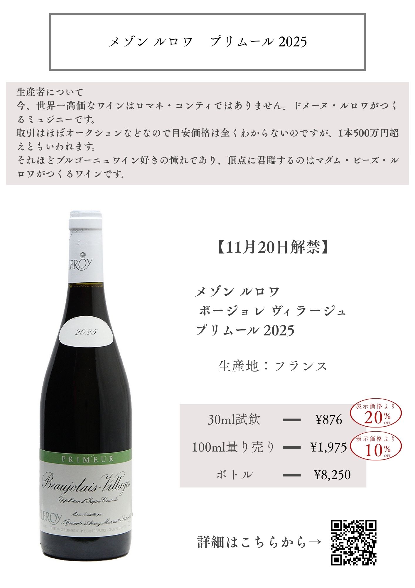 試飲販売ワインはすべて100mlボトルでの量り売りが可能です。